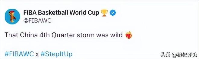 赛后,FIBA官方点赞中国男篮发文:“中国男篮在第四节打出的那波风暴真是太猛了!”
