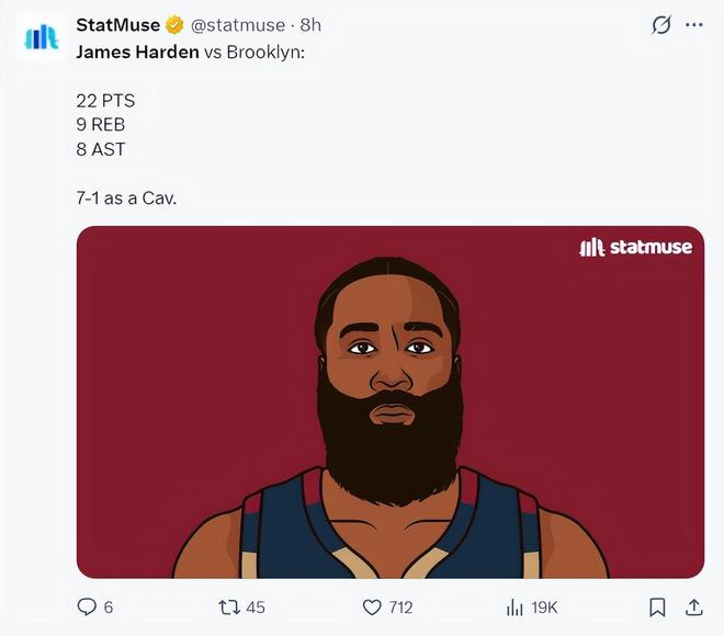 哈登加盟骑士后场均33分钟,19.3分5.1篮板8助攻,命中率50%,三分命中率50%,罚球命中率81%,在他登场的比赛中骑士7胜1负,哈登一下就成为了新的克村领头羊。